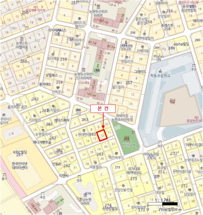 4. 토지이용계획:제2종 일반주거지역(7층 이하), 상대보호구역(교육환경), 대공방어협조구역, 과밀억제권역으로 지정되어 있어 향후 개발 시 관련 제한사항을 확인해야 합니다.