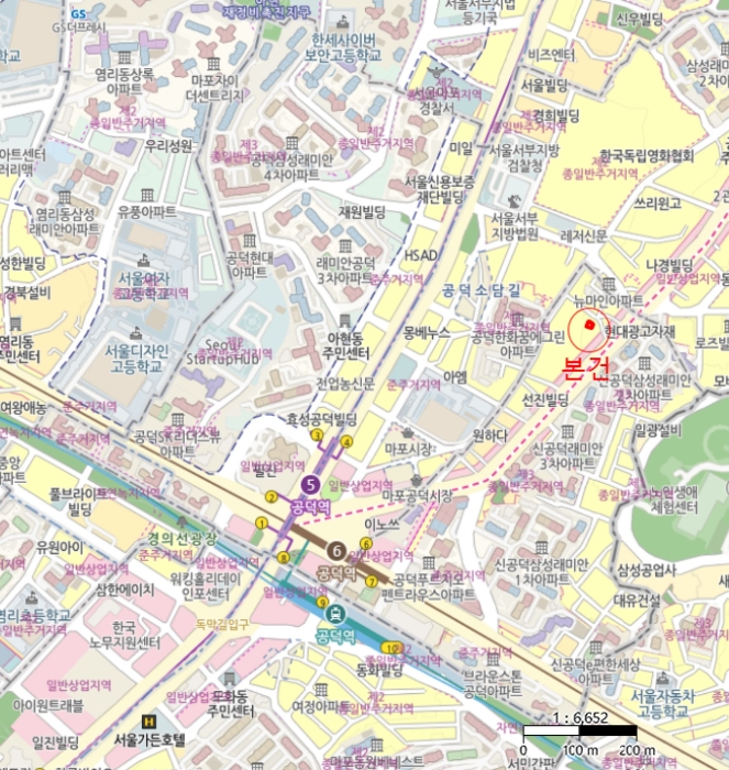 이 물건은 서울특별시 마포구 신공덕동에 위치해 있으며, 서울 지하철 5호선과 6호선이 교차하는 공덕역 북동측 인근에 자리하고 있습니다. 주변 환경은 아파트, 업무시설, 각종 근린생활시설, 다세대주택 및 단독주택이 혼재된 전형적인 도심 주거지역입니다.