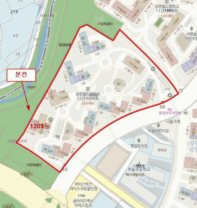 7층에 위치한 본 물건은 동간 거리가 넓게 확보되어 있고 전면에 건물 가림이 없어 채광과 조망이 우수한 편입니다. 단지 내 1205동은 중심부에 위치한 라인으로 선호도가 높은 동에 속합니다.