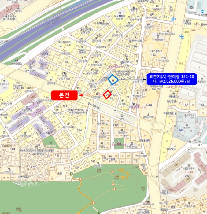 이 물건은 서울특별시 서대문구 연희동 소재"서대문구청" 남서측 인근에 위치하며, 주변은 단독주택 및 소규모 공동주택, 근린생활시설 등이 소재하는 주택지대입니다. 특히연세대학교까지 약 1km거리에 위치하고 있어 대학생 임차 수요가 풍부한 지역입니다.