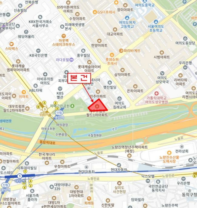 주변 상권도 매우 발달되어 있습니다. 이마트 여의도점(504m), 여의도 한강공원, 샛강생태공원이 도보 거리에 있어 여가생활을 즐기기에도 최적입니다. 또한 여의도성모병원이 400m 거리에 위치하여 의료 접근성도 뛰어납니다.
