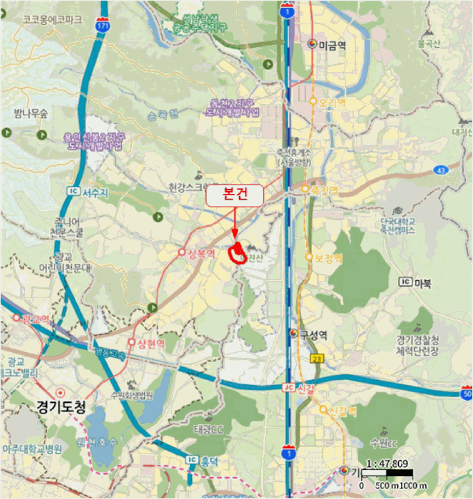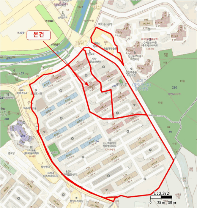 본 아파트는 경기도 용인시 수지구 풍덕천동 소재 이현중학교 남서측 인근에 위치하고 있습니다. 주변은 아파트단지, 근린생활시설 및 학교 등이 혼재하고 있어 생활 인프라가 잘 갖추어져 있습니다.